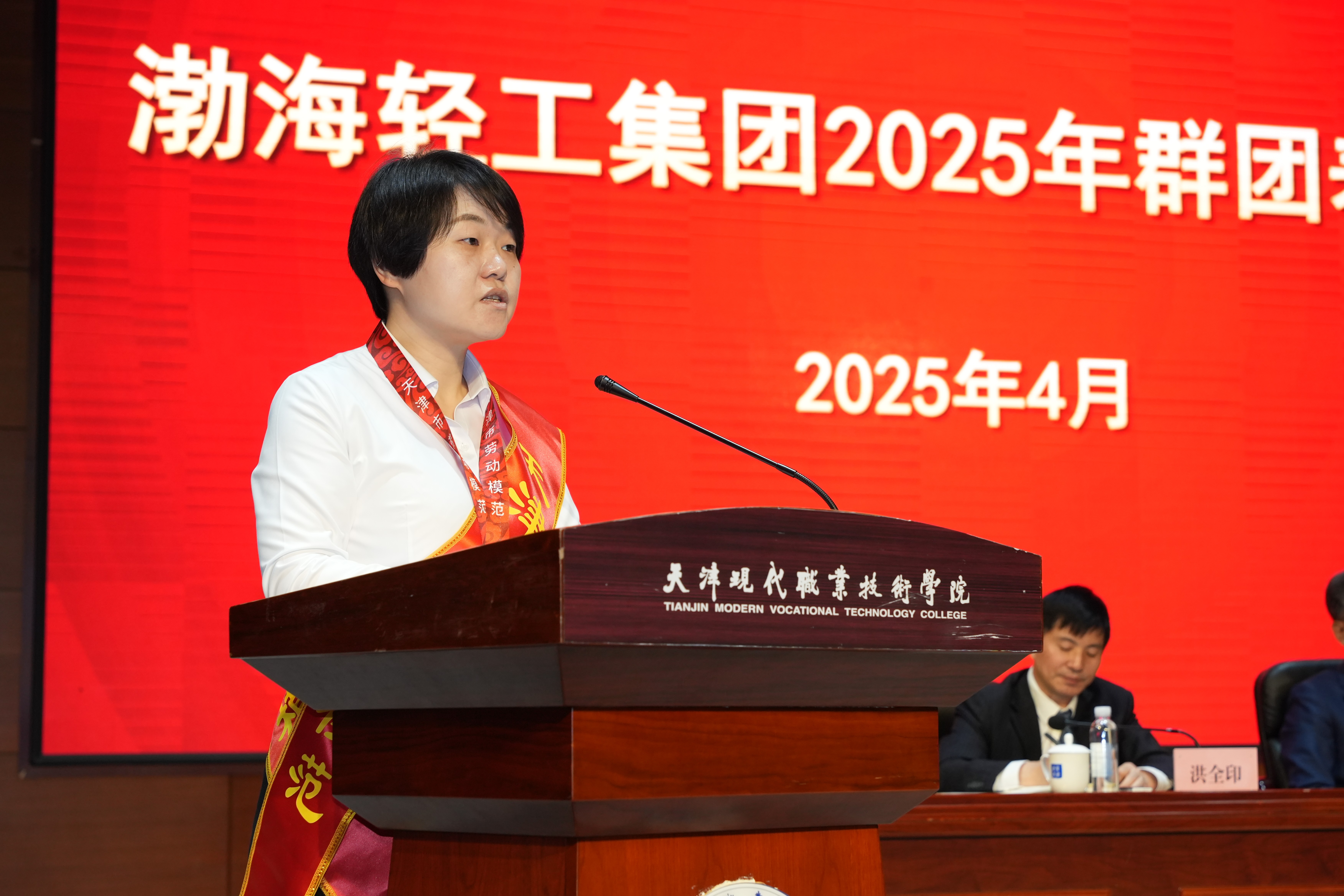 在表彰环节之后,天津市劳动模范、我院援藏教师皮琳琳以《在奉献中成长,甘为职教螺丝钉》为题,分享躬耕职教、播撒火种的奋斗历程。她以“匠心育匠才”,将“工匠精神”融入实训课堂,带领学生研制离网型光伏系统,让藏族学子扎西尼玛从辍学困境蜕变为新能源社团骨干;以“技能报家国”,指导学生斩获全国职业院校技能大赛二等奖,填补昌都职校历史空白,并攻克高原光伏发电技术瓶颈,推动“风光互补微电网”技术在11个乡镇落地,惠及牧民增收;以“火种传薪火”,创建“新能源名师团队工作室”,培养27名藏族青年教师,促成津藏校企合作10余项,筹集资金播撒职教火种。皮老师鼓励大家珍惜荣誉、再接再厉,继续在各自的岗位上发光发热。同时,皮老师代表受表彰群体发出倡议书,号召全体渤轻人思想铸魂、创新破局、实干强基、聚力攻坚,共绘集团高质量发展新蓝图。